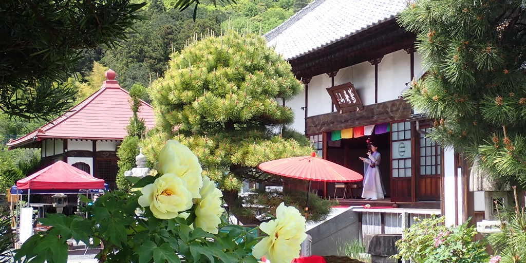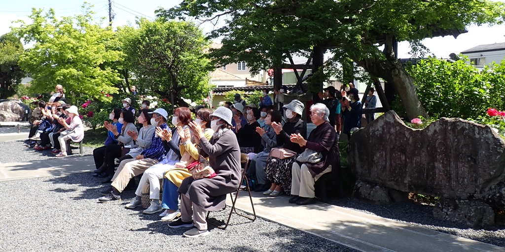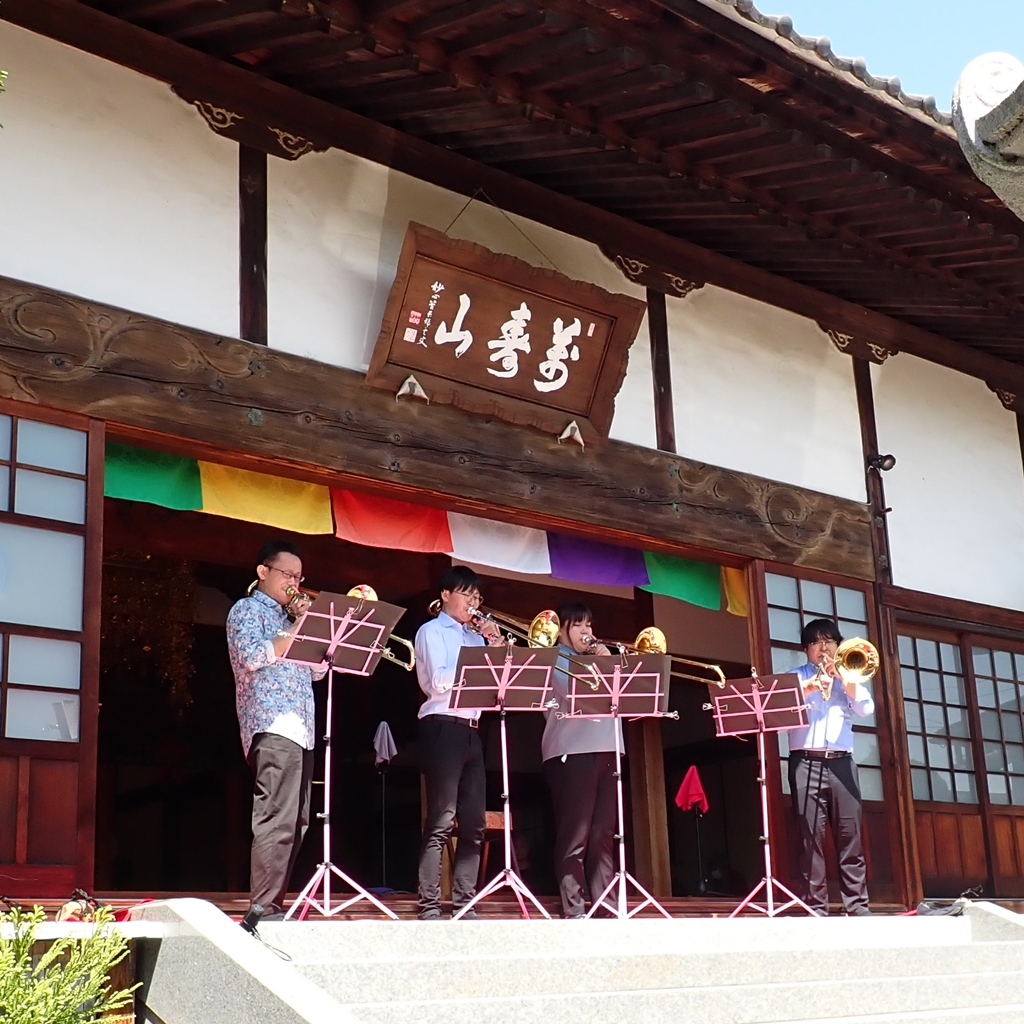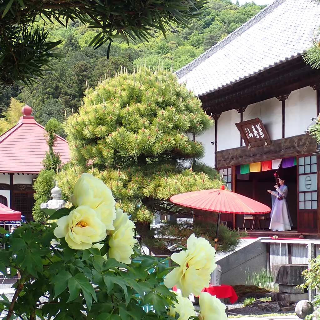光明寺で4月22日、23日に恒例のぼたん祭りが行われました。22日は、お釈迦様のお誕生を祝う『降誕会』が行われ、23日には「二胡演奏」ならびに「トロンボーンの演奏」が行われました。『降誕会(ごうたんえ)』は、古より『花まつり』の名で親しまれてきたお祀りです。光明寺では、毎年、牡丹の花が満開になりますこの時期、降誕会の法要と共に様々な催しを行っています。